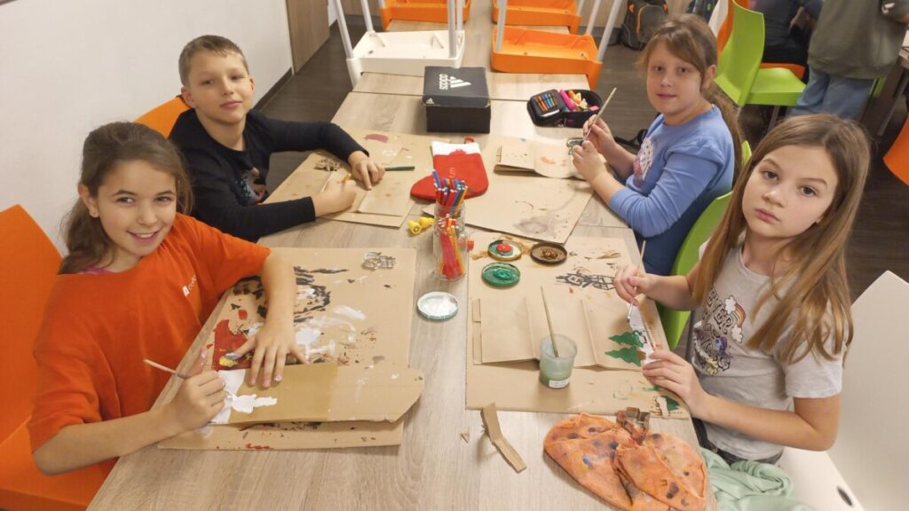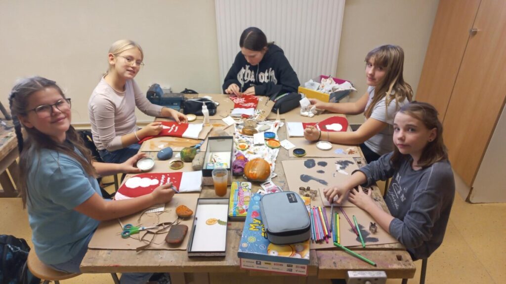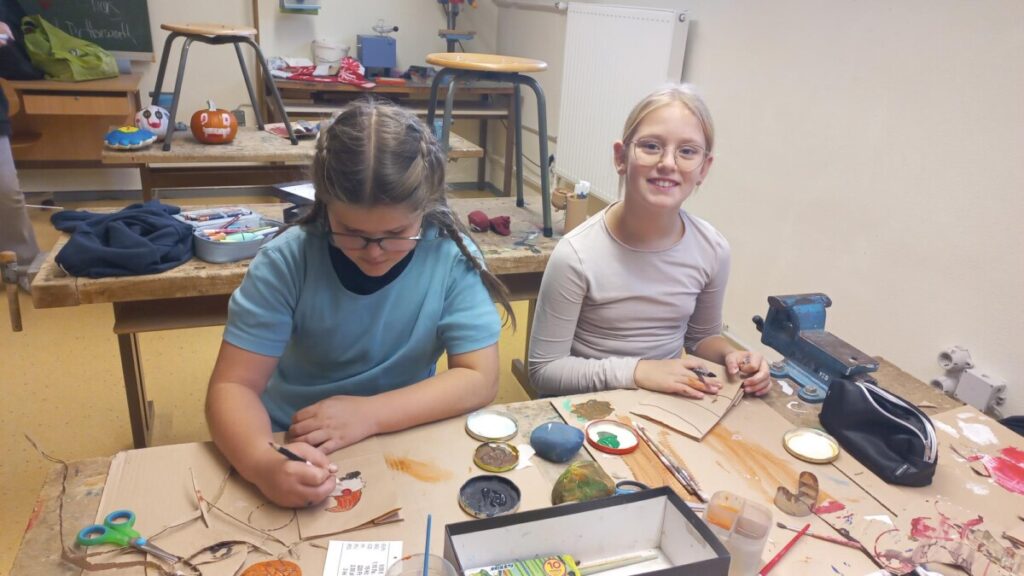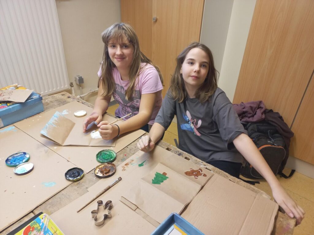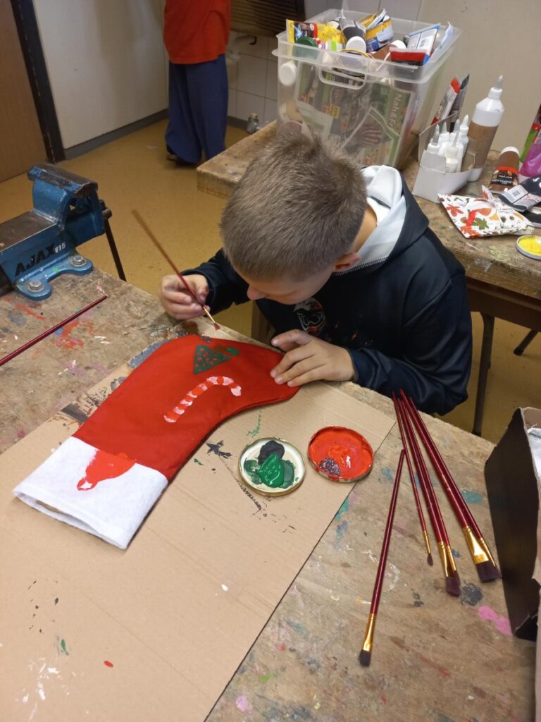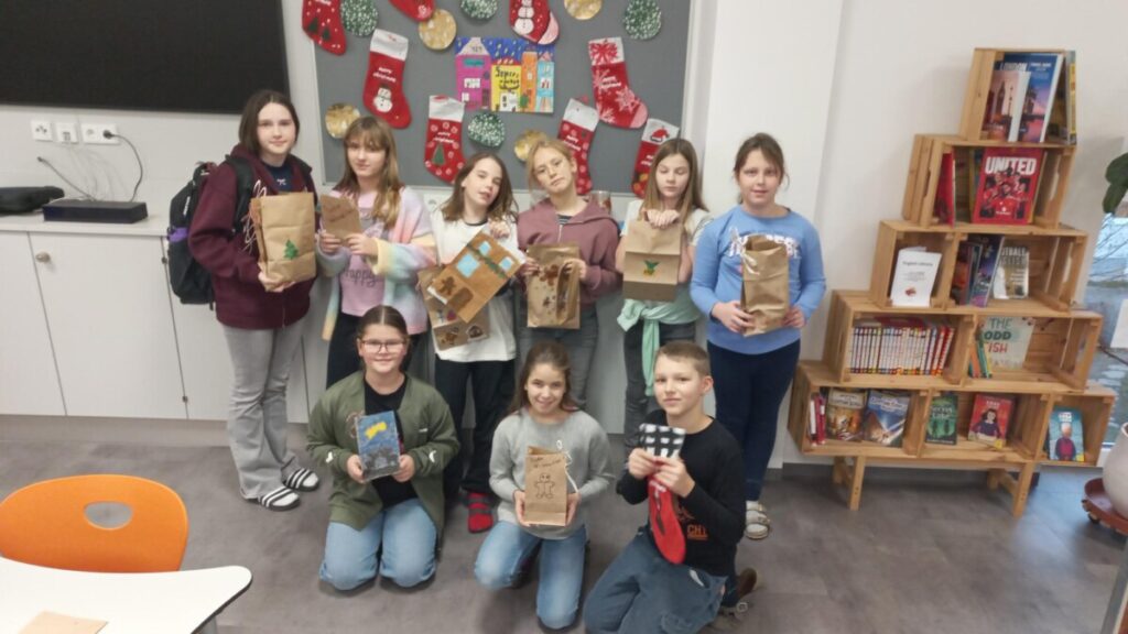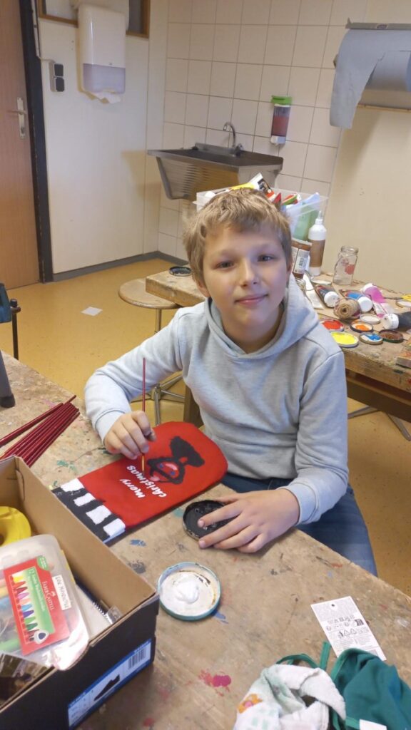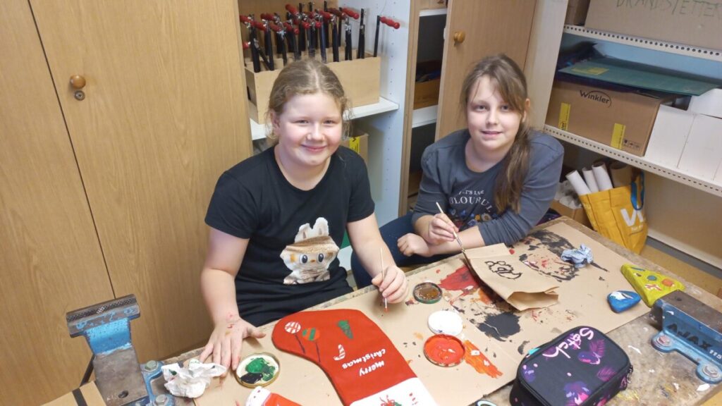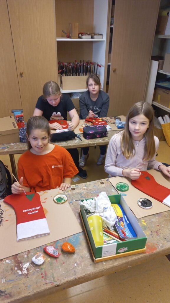 Fleißig werken schon unsre Weihnachtswichtel in der derzeitigen Weihnachtswerkstätte in KG: Die Kinder fertigten bereits aus nachhaltigen Papiersackerln selbstbedruckte Geschenkssackerl für das heurige Weihnachtsfest an. Rote Stoffweihnachtssocken wurden mit viel Freude bemalt, bedruckt und können zu Weihnachten zum Befüllen aufgehängt werden. Derzeit zieren diese kleinen Geschenksverpackungsideen unsere Aula, die seit der 1. Adventwoche in weihnachtlichem Lichte erstrahlt!