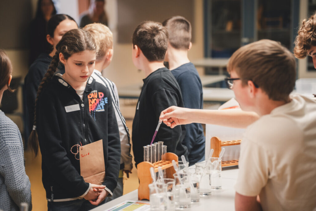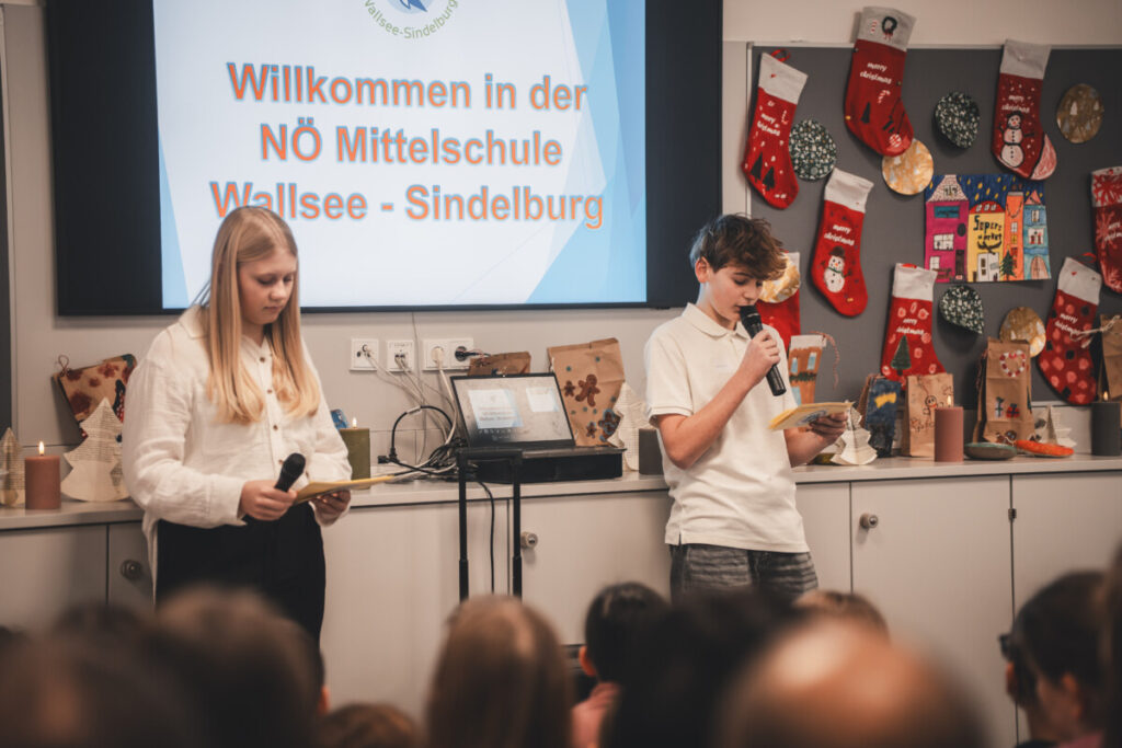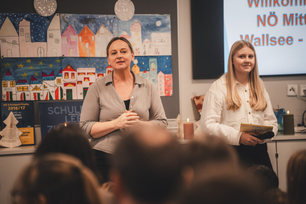 Am 5. 12. 2025 öffnete unsere Mittelschule ihre Türen für zahlreiche interessierte Kinder und deren Eltern. Sie kamen unserer Einladung nach und nutzten die Gelegenheit, unser vielfältiges schulisches Angebot kennenzulernen und einen Eindruck vom Lernen und Leben an der Schule zu gewinnen. In der Aula versammelten sich unsere Gäste und wurden von unserer Schulleiterin Frau Ingrid Hall und den Schulsprechern begrüßt. Zur musikalischen Umrahmung sang unser Schulchor und es spielte die Bläsergruppe.